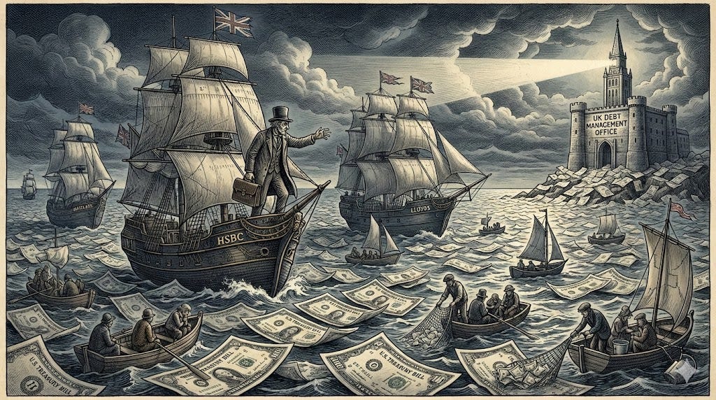 Second, if we instead assume that T-bill expansion is part of a broader increase in debt issuance, then it doesn’t matter who the buyer of gilts/T-bills is - banking reserves are drained at issuance. This point is subtle, a function of the fact that the government treasury keeps its “cash” in an account at the central bank, as reserves. When the DMO issues debt, reserves are moved from the banking system to the treasury account regardless of who buys the debt. This is why the US Treasury’s General Account (TGA) has become a key part of US money markets - because the US treasury’s “cash” directly impacts the amount of reserves in the system as its balance rises and falls. But this has nothing to do with retail participation.