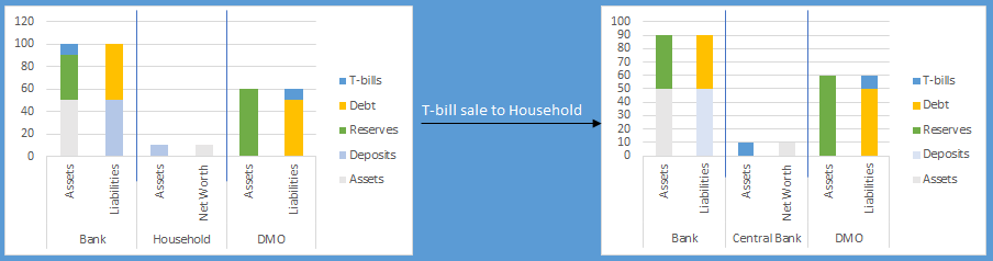 This becomes even clearer if we assume, quite reasonably, that households will not be involved in primary issuance but instead will buy T-bills in the secondary market. In this case the reserves are destroyed at issuance when a GEMM buys the newly issued bills. But when that GEMM sells its T-bills to a retail investor, it’s just a normal exchange of assets, deposits, and reserves