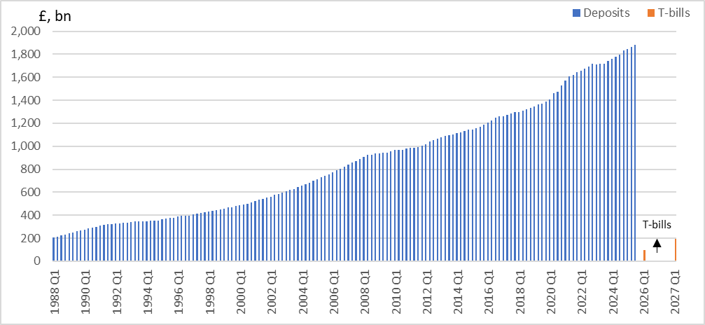 The UK banking system has c. £1.7trn of bank deposits, across both time and sight deposits. So, if the size of the T-bill market doubled, increasing by c. £100bn, and all of that went to households (unlikely) that would only amount to c. 7% of deposits - for context, total household deposits grew by £70bn last year so this would knock back the deposit growth in the short term, but it would hardly be a seismic shift in the composition of bank liabilities.