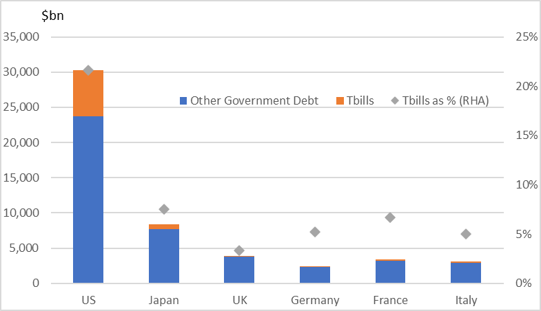 The UK T-bill market is currently just £105bn, versus a total stock of government debt of £2.9trn - or about 3.6% of government debt. This compares to c. 22% in the US.