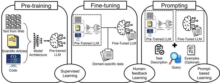 In the first stage, the LLM is fed a huge amount of text and learns, through repetition, how to make reasonable guesses as to the next word in a sequence.